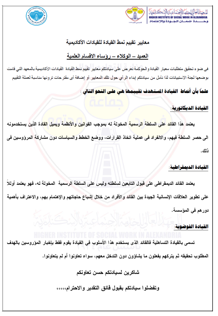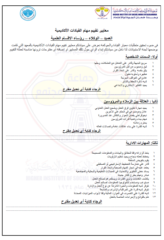 المعهد العالى للخدمة الاجتماعية بالاسكندرية > أدلة ووثائق وحدة ضمان الجودة